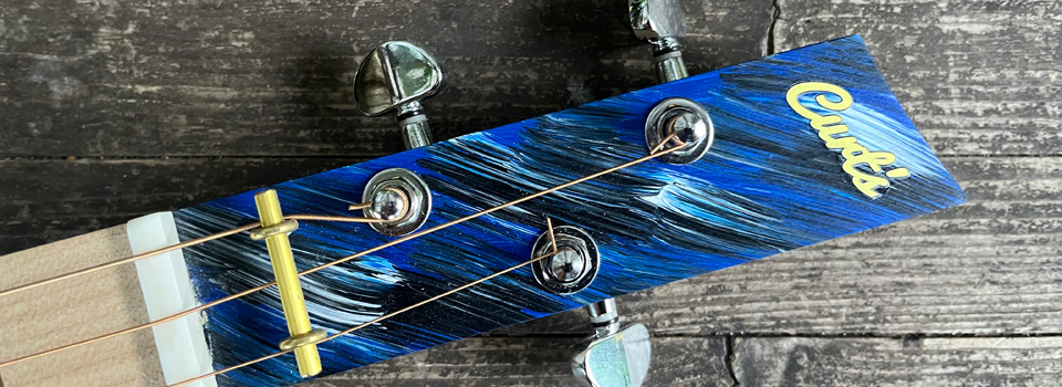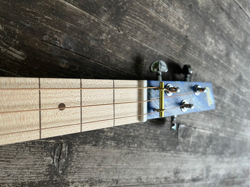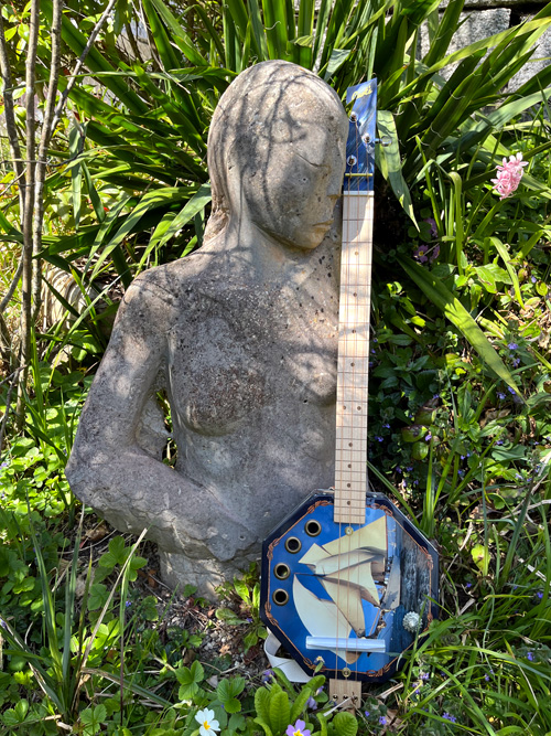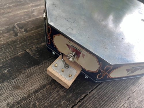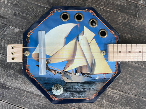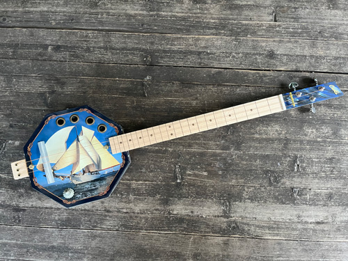Blechbüchse sechseckig mit Segelschiffmotiv. Bundlos, zum Sliden mit Bottleneck